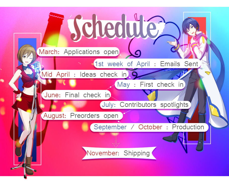 You must be at least 16+ to applyYou can apply for more than one role, but you have to fill up the other application form separately.You have to submit at least 5 pieces of work (fanfics/fan arts) or link a gallery/archive instead. If you send the files via google drive be sure that we can access to the gallery!For merch artist: please send us some samples showing off the style you want to work with or, if you already provided artworks for merchandise in the past, you can show us those instead.The submitted pieces can be not vocaloid relatedYou must have a discord account since it's our main source of communication!Please remember that the zine is SFW but some pieces can contain Meiko's showing breast or Kaito chest.